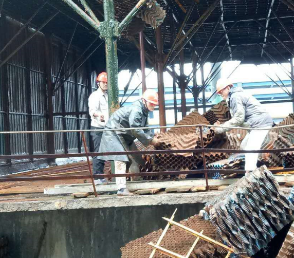 無論自身如何泥水相伴,冷卻塔上下的檢修人員你拆我接,你接我送,緊張有序、團(tuán)結(jié)一致地進(jìn)行著大面積的填料拆取、塔桿更換工作。