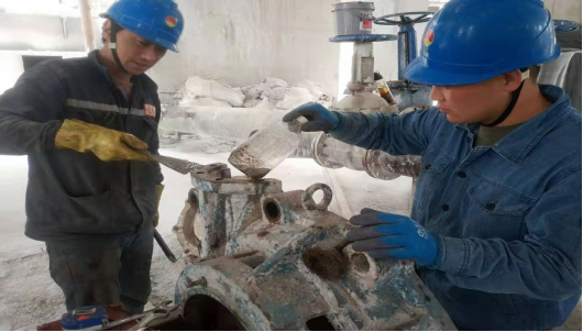 穿過馬路,步入公司核心生產(chǎn)區(qū)域。在生料裝置各個現(xiàn)場,1#號濃縮池底安裝渣漿泵,1#-16#刮板機(jī)下料口技改、堆料機(jī)1502皮帶硫化、循環(huán)風(fēng)機(jī)、尾排風(fēng)機(jī)、V選、混料機(jī)、輥壓機(jī)檢修的完成以及1102皮帶托輥檢查及軸承潤滑的進(jìn)行。此時,在酷暑下,一個個精神充沛的工友們頂著烈日的酷曬,正聚精會神的進(jìn)行著檢修作業(yè),他一只手扶著設(shè)備,一只手使勁的搬動著板子,那動作仿佛撫摸初生嬰兒的笑臉,那種眼神好似在說:孩子,你快成型了,等你成型組裝后,就會被帶動其他設(shè)備和諧運(yùn)轉(zhuǎn)。他們是設(shè)備正常運(yùn)轉(zhuǎn)的一個個信使,傳遞著安全生產(chǎn),減輕勞動強(qiáng)度,促進(jìn)人們對公司健康發(fā)展的美好祝愿。