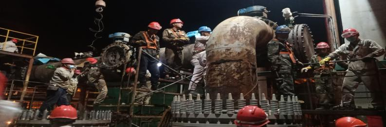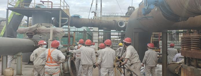 第一天氯乙烯裝置迅速拉開檢修戰(zhàn),先是對(duì)水堿洗組合塔進(jìn)、出管口線漏點(diǎn)進(jìn)行消除,安排吊車及相關(guān)人員在場(chǎng),辦證,拆除管節(jié)前的準(zhǔn)備工作做好后立即組織人員開始卸閥門,在檢修工和吊車的完美配合下,漏點(diǎn)的管節(jié)拆除完成,后安排生產(chǎn)科主管去平羅襯塑。另外一邊精餾場(chǎng)地也是熱鬧非凡,檢修工作雖然忙碌但不盲目,人員拆除,你卸閥門,他焊缺口,我高空作業(yè),吊車協(xié)助拆卸高低塔塔盤篩網(wǎng),安全著陸后立即組織人員進(jìn)行清洗,清洗完成后又組織安裝,一切如行云流水,維修工熟悉的手法給安全檢修及順利開車又加了一道保險(xiǎn)。混合脫水管線技改是片區(qū)及集團(tuán)公司領(lǐng)導(dǎo)關(guān)注的重點(diǎn),此次檢修,管線碰口,也是尤為重要,在相關(guān)技術(shù)人員及維修工的協(xié)作下,做了氣相預(yù)留口,為后期混合脫水項(xiàng)目開車平穩(wěn)運(yùn)行埋下了伏筆。