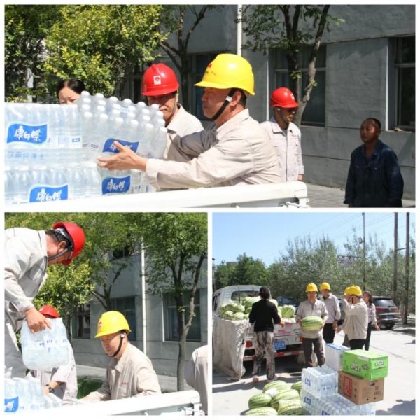 高溫如虎,關(guān)愛似海。集團(tuán)公司黨委副書記尚興和其他領(lǐng)導(dǎo)把西瓜、飲料、茶葉等慰問品送到一線員工手中,送上集團(tuán)公司黨委對(duì)一線員工的深切關(guān)愛,員工們對(duì)集團(tuán)公司黨委的深切關(guān)懷深表感謝,戰(zhàn)高溫、斗酷暑、保安全的信心倍增。